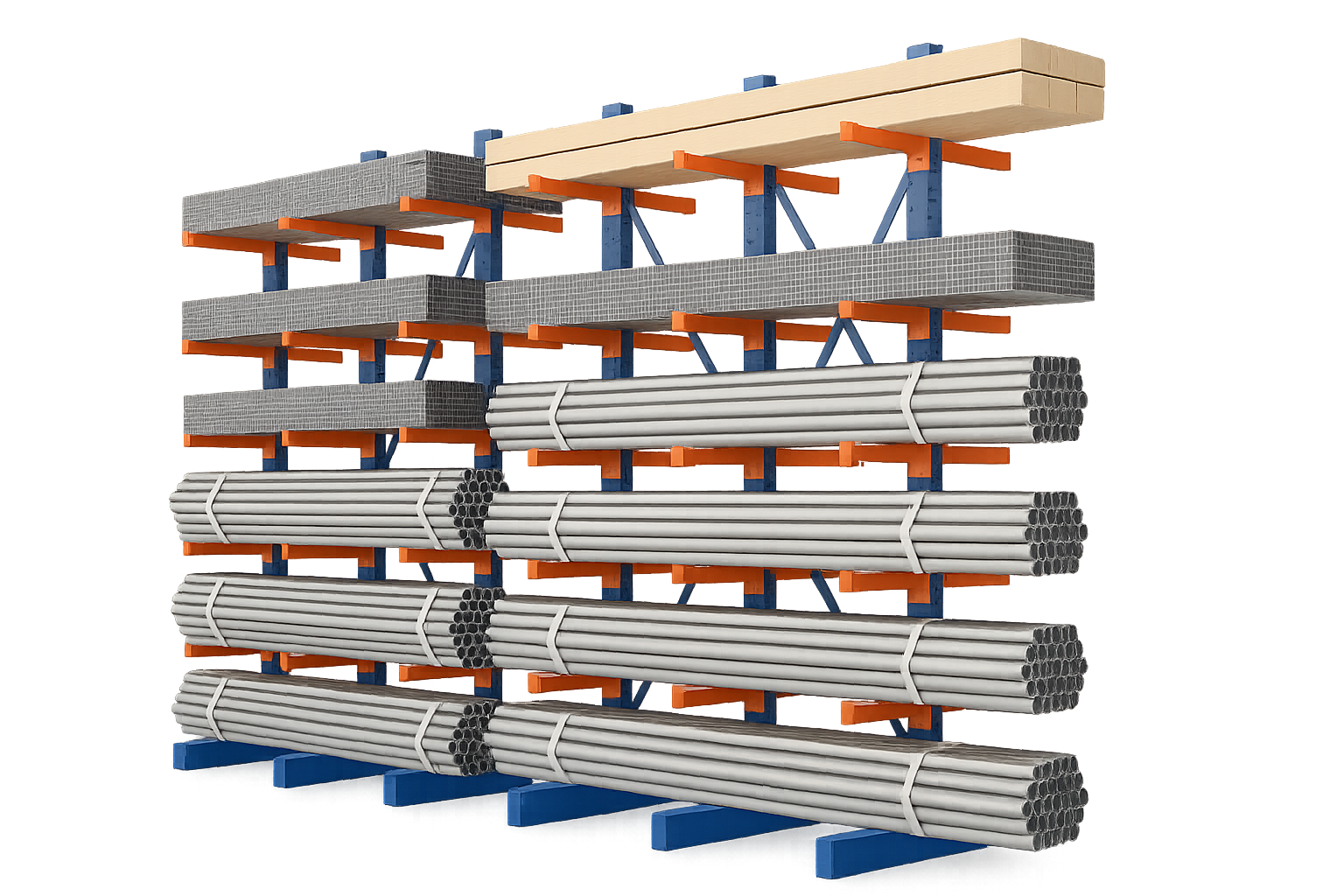 - Лёгкие консольные стеллажи — для складов строительных магазинов, мебельных производств, деревообрабатывающих предприятий. Подходят для алюминиевых профилей, пластиковых труб, длинномерных деталей и лёгких рулонных материалов.