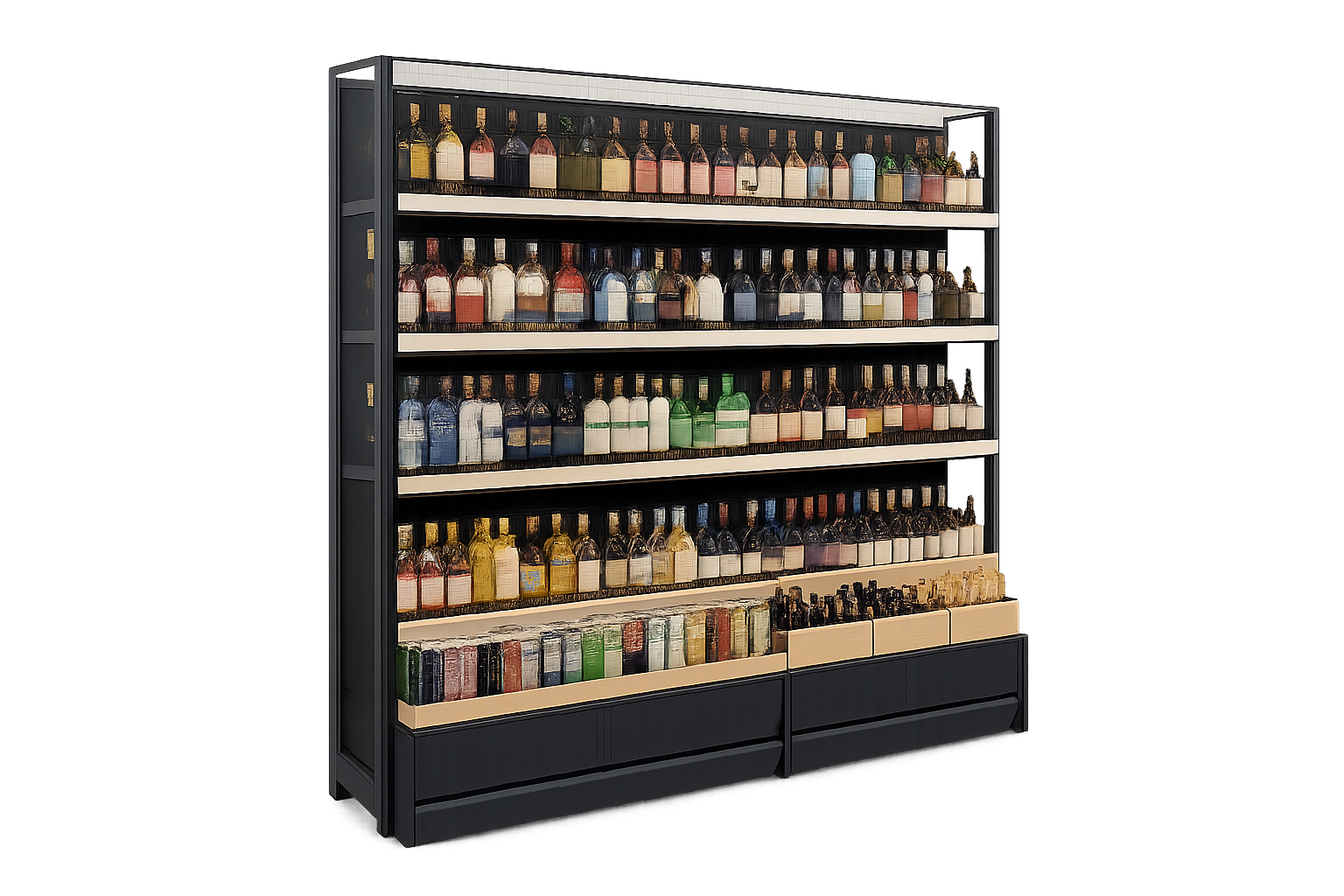 Стеллажи для алкогольной продукции — это специализированные металлические конструкции, предназначенные для хранения и демонстрации бутылок с вином, крепким алкоголем и сопутствующими товарами. Они обеспечивают правильное распределение нагрузки, устойчивость и безопасное размещение бутылок, исключая риск опрокидывания и повреждений. Такие стеллажи используются в продуктовых магазинах, супермаркетах, специализированных винных бутиках, алкогольных отделах. Они позволяют организовать удобную навигацию по ассортименту, выделять отдельные бренды и категории, а также формировать аккуратную и привлекательную выкладку. Металлические стеллажи для алкоголя отличаются длительным сроком службы и простотой обслуживания. Они устойчивы к механическим воздействиям, легко очищаются и сохраняют презентабельный внешний вид даже при интенсивной эксплуатации. Это особенно важно для магазинов с высокой проходимостью и большим оборотом продукции. Конструктивные особенности