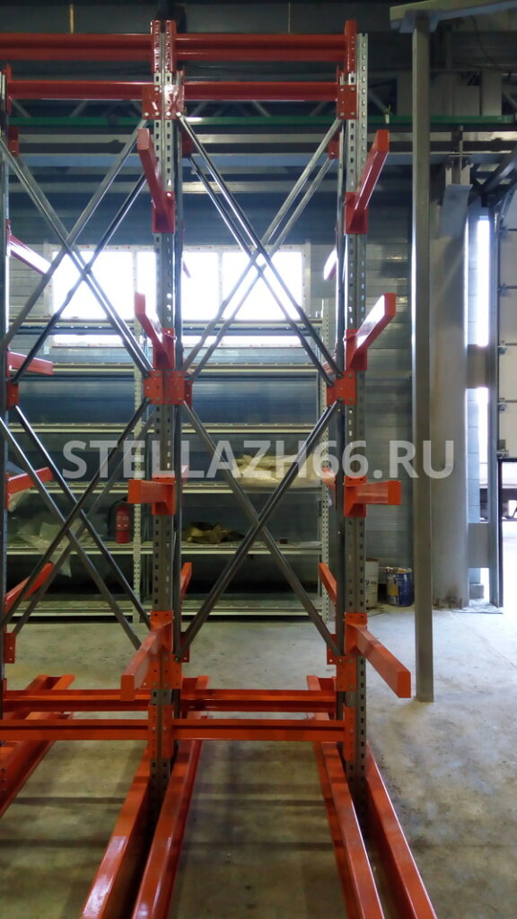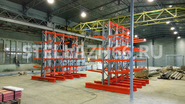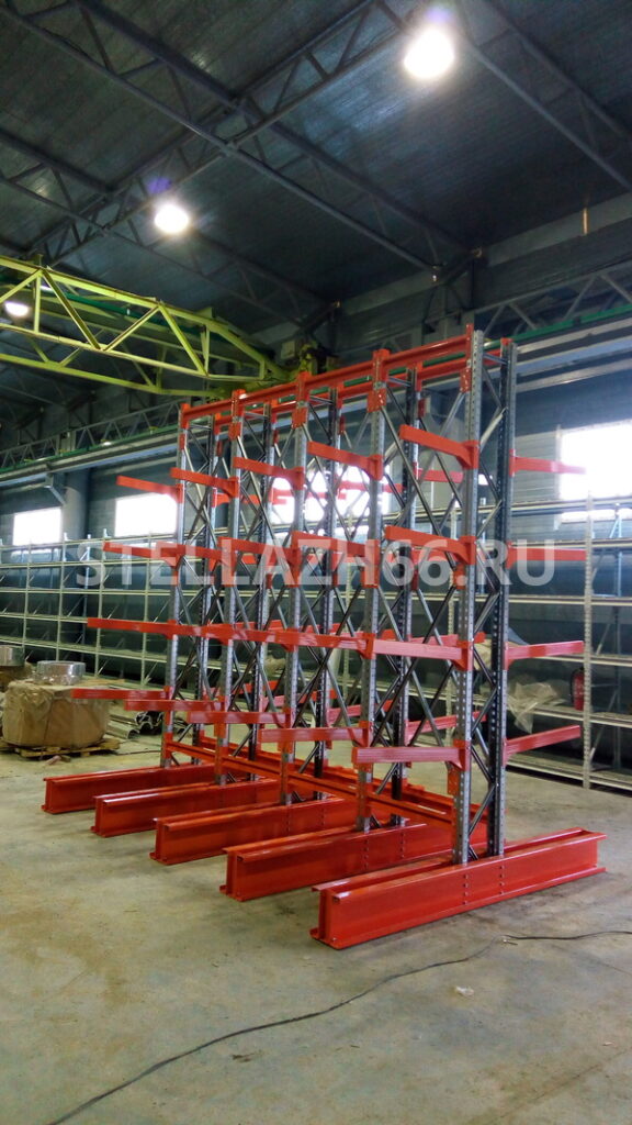 Консольный стеллаж двусторонний на основе промышленной стойки 89 мм фронтального стеллажа.