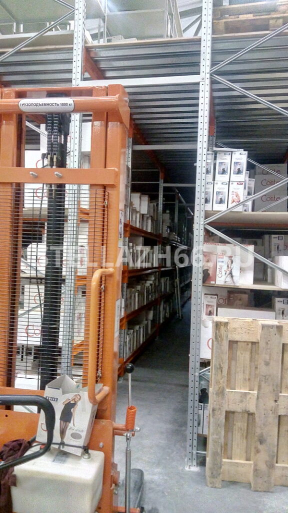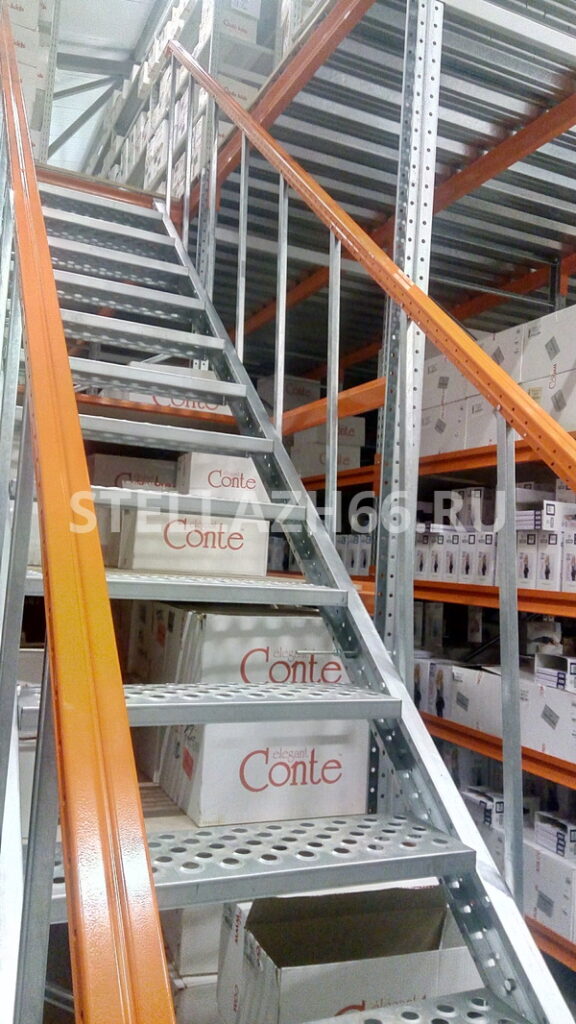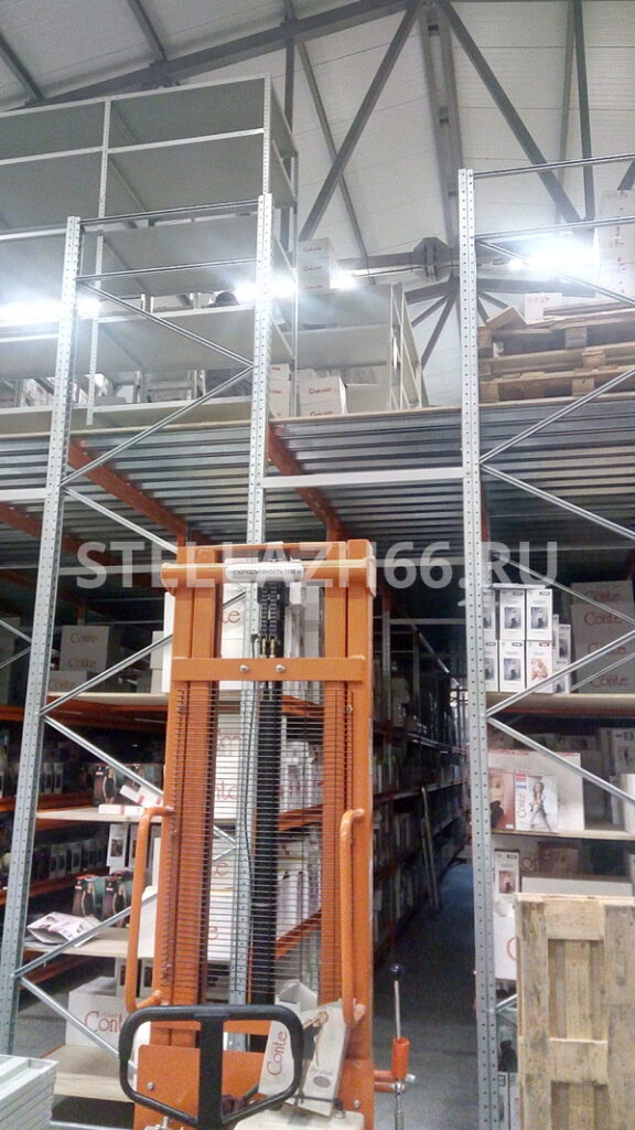 Мезонин двухэтажный на основе фронтальных палетных стеллажей размерами 18800 мм х 17700 мм. Первый этаж — полочное хранение (с нагрузкой до 400 кг) на балках с настилом из ДСП 16 мм, второй этаж — открытая площадка напольного хранения. Заказчик установил грузовые стеллажи рядами на втором этаже. Межэтажное перекрытие -профильный настил НС35 0,7 мм оц. и слой фанеры 1525*1525*15 мм с гарантированной нагрузкой до 350кг/м2. Мезонин оборудован на противоположных углах двумя лестницами с ступенями с противоскользящей перфорацией и ограждением по периметру.