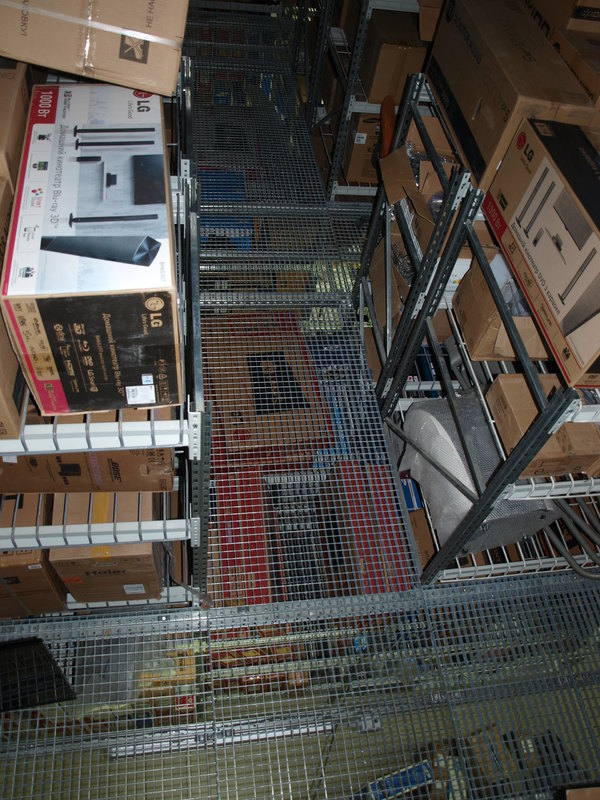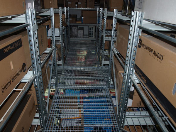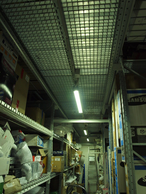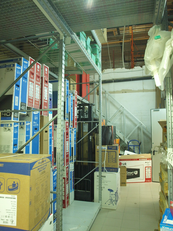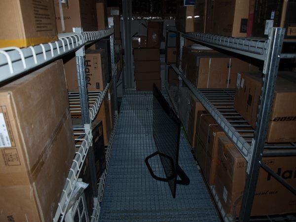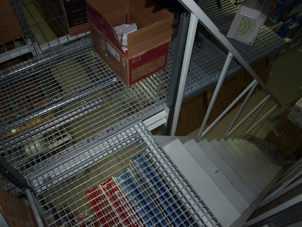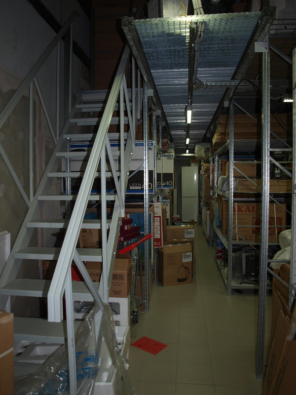 Задача: на основе грузовых стеллажей необходимо построить мезонин. По требованию пожинспекции решетчатый крашенный настил полок (пруток 8 мм) с проницаемостью не менее 80% от площади хранения. Настил пола оцинкованный так же решетчатый (металлическая полоса 30х3 мм плюс пруток 5 мм), проницаемость не менее 80%.